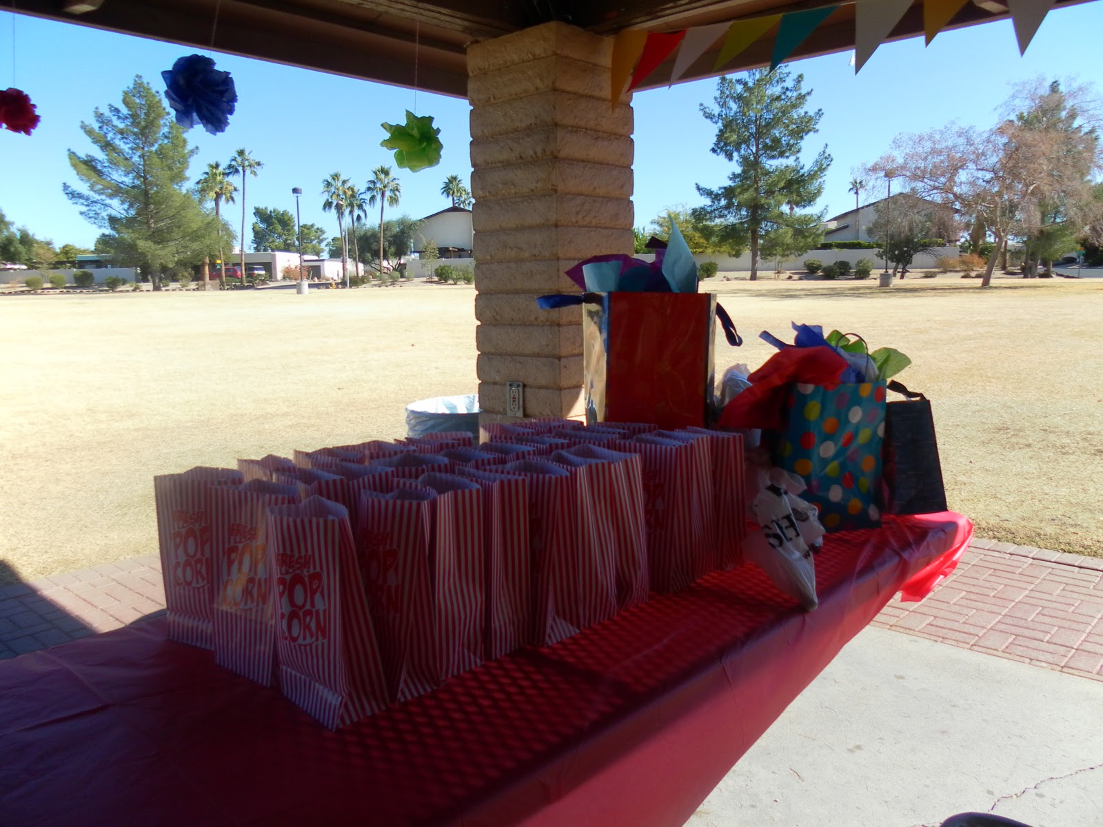 | The Popcorn Bags were the kiddies loot bags...to start them off they had little bottles of bubbles, I made them mustaches on stick, stickers, and candy necklaces. The bags were from The Dollar Tree and they came 30 to a bag. Score. |